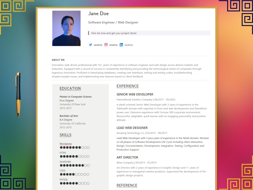 This resume template lets you showcase your skills, education, past experiences and more in just a few minutes. Take advantage of this opportunity to make a great impression on your future employer. Send online or print in PDF