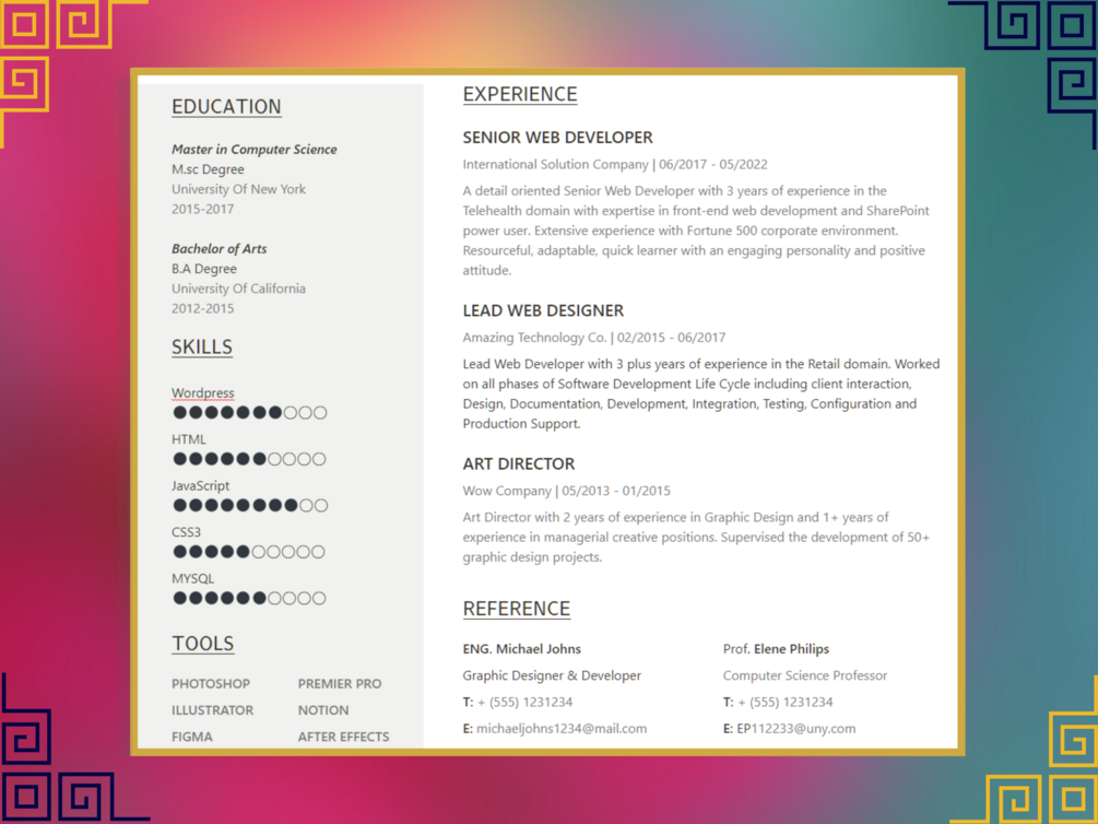 This resume template lets you showcase your skills, education, past experiences and more in just a few minutes. Take advantage of this opportunity to make a great impression on your future employer. Send online or print in PDF
